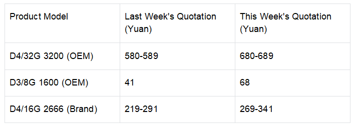The DRAM market has witnessed the largest single – week price increase this year, and merchants often encounter situations where “prices rise within an hour” when purchasing goods. In the quotations of OEMs and brands, all capacity segments of the D3 and D4 sectors have seen price increases, with the price increase of D3 reaching 43%-66%. The specific quotation changes of some products are as follows: